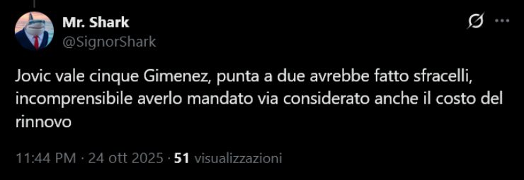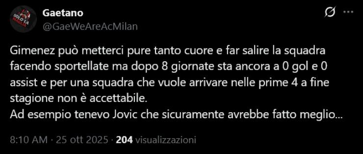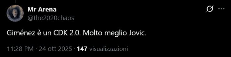 In questa stagione Gimenez ha totalizzato 10 presenze, 1 gol e 2 assist tra Serie A e Coppa Italia. L’unico gol lo ha segnato nella coppa nazionale, contro il Lecce, mentre in campionato è ancora a digiuno. Tra reti annullate, alcune sbagliate e partite con pochi palloni buoni ricevuti, non sta riuscendo a dare il contributo auspicato. Se contro la Fiorentina il suo ingresso a partita in corso aveva dato una scossa alla squadra, contro il Pisa la sua prestazione da titolare è stata evanescente. Massimiliano Allegri lo ha persino invitato a svegliarsi, segnale enorme della sua insoddisfazione.